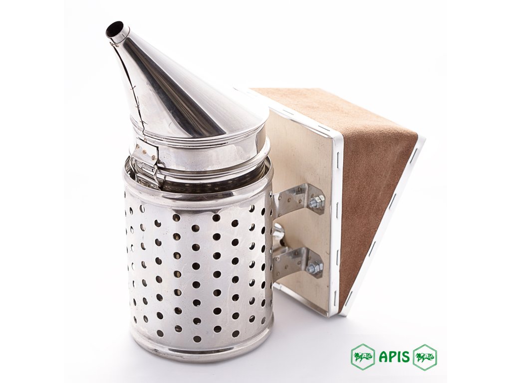 Včelařský kuřák malý nerezový Dýmák slouží k uklidnění včel. Do dýmáku vložte palivo nebo knoty a zapalte. Vzniklý dým za pomoci měchu vylučujte ven z dýmáku. Dým včely uklidní a neútočí na včelaře. Dýmák má vyndavací vložku na palivo a také změnšovací vložku - plíšek. Výška: 25 cm, šíře 20 cm, průměr 11 cmDoplňkové parametry