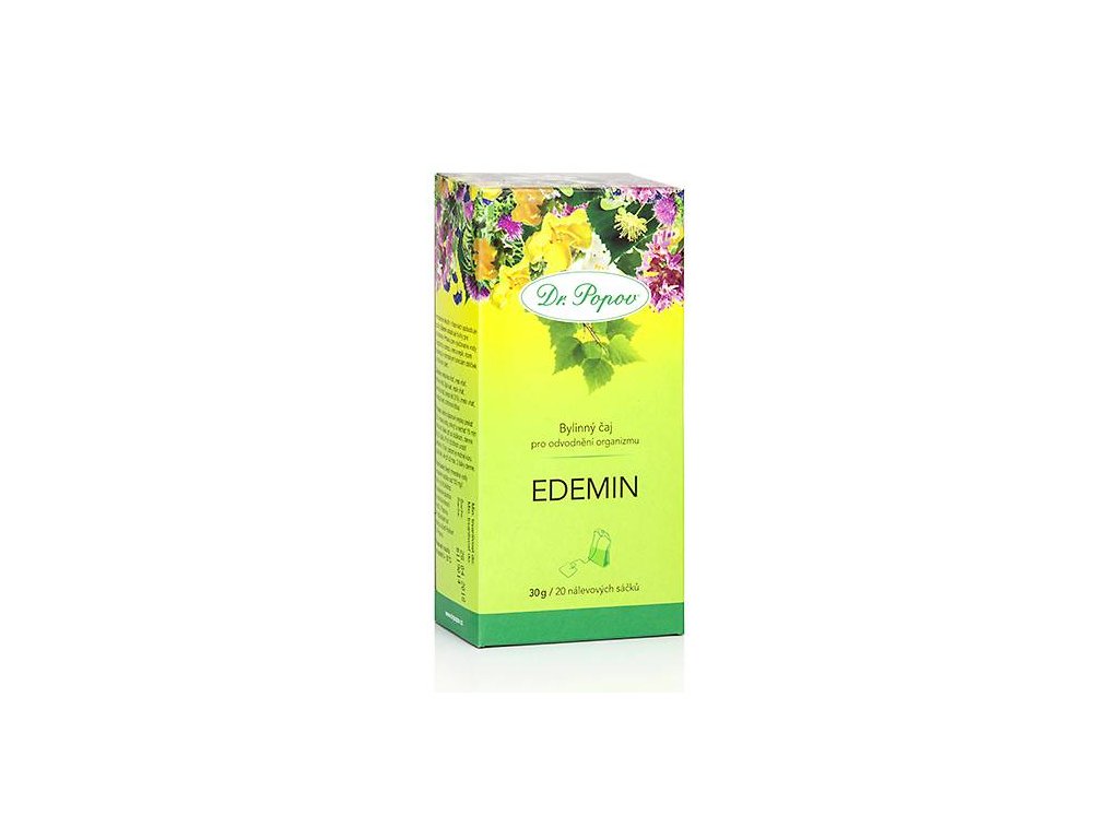 Odvodnění: Hromadění tekutin v tkáních způsobuje otoky. Kdy pít Čaj na odvodnění Edemin: Čaj na odvodnění Edemin obsahuje směs z 10 prověřených bylin. Důležitou použitou bylinou je kopřiva, která podporuje vylučování vody z organizmu, podílí se na zdravé činnosti ledvin a celkově osvěžuje tělo. Také další obsažené byliny (bříza, vřes a řepík) přispívají ke správnému fungování ledvin a močových cest. Jak Čaj na odvodnění Edemin připravit a užívat: Jeden nálevový sáček přelít 0,25 l vroucí vody, přikrýt a nechat 15 min vylouhovat. Čaj pít po doušcích, denně pít až 3 šálky. Po 6 týdnech udělat přestávku 10 dní, pak je možné kúru zopakovat, ale pít již max. 2 šálky denně. Složení: meduňka nať, vřes nať, kopřiva nať, lípa květ, řepík nať, rozrazil nať, bříza list (3 %), jmelí nať, chrpa květ, citronová tráva Ostatní informace: Nepřekračujte denní doporučenou dávku. Není vhodné pro děti, těhotné a kojící ženy. Výrobek není určen jako náhrada pestré stravy. Uchovávejte v suchu při teplotě 5-25 °C. Obsahuje 20 nálevových sáčků.Doplňkové parametry