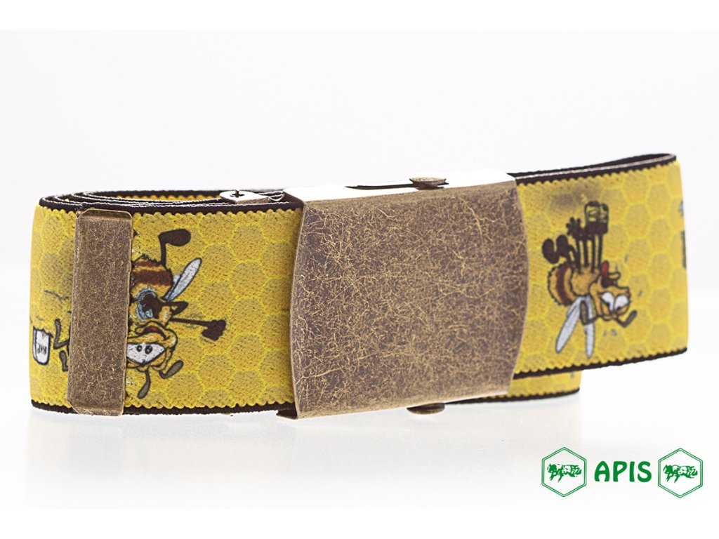 Gumový pásek se včelami Pásek slouží k upevění kalhot. Na pásku jsou znázorněné včelky. Vhodný jako dárek pro včelaře. Materiál: pružná guma, spona kovováDoplňkové parametry
