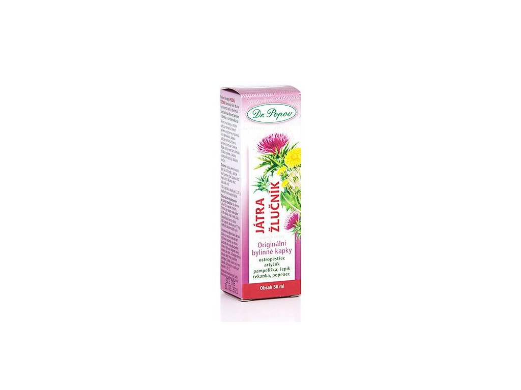 Kdy se vám budou bylinné kapky Játra – žlučník hodit: Originální bylinné kapky Játra – žlučník obsahují 6 druhů vynikajících bylin, důležitých pro správnou činnost jater a žlučníku, jejich detoxikaci a regeneraci.Ostropestřec mariánský a artyčok, oblíbené antioxidanty, pomáhají udržovat zdravou činnost jater, významně přispívají k detoxikaci jater a podporují správné trávení. Ostropestřec navíc působí na naši přirozenou obranyschopnost a odolnost organismu. Obsažená pampeliška udržuje normální funkci jater, stimuluje trávení a pomáhá s vylučováním. Řepík podporuje zdravou funkci žlučníku a jater a také pomáhá s detoxikací. Čekanka a popenec doplňují důležité hořčiny. Jak bylinné kapky Játra – žlučník správně užívat: Používání bylinných kapek je velmi snadné. Stačí 3 x denně užívat 20 kapek tinktury. Tinkturu je možno nakapat i do nápoje, např. vody, čaje. Doporučená denní dávka (60 kapek) obsahuje po 17 mg všech obsažených bylin. Jak jsou bylinné kapky vyráběny? Pečlivě vybrané atestované byliny macerujeme v jemném 60% potravinářském lihu za studena – jedná se o způsob výroby, který je generacemi ověřený jako nejlepší, protože líh je pro extrakci ideální a kapky pak mají vysokou koncentraci účinných látek. Líh navíc doplňujeme vodou, takže v kapkách působí dva činitelé a vyluhuje se tedy i více účinných látek. Využíváme odstřeďování za vysoké rychlosti otáček, abychom z bylin získali více účinných látek. Dlouhá macerace mikronizovaných (jemně rozemletých) bylin v lihu je velmi důležitá a tento proces nelze porovnávat s prostým rozmícháním extraktu.Všechny směsné bylinné kapky Dr. Popova vycházejí z originálních receptur, které zaručují vysokou účinnost výsledné tinktury.Všechny extrakty jsou notifikovány Ministerstvem zdravotnictví ČR. Složení bylinných kapek Játra – žlučník: voda, jemný kvasný líh (40% obj.), artyčok nať, ostropestřec plod, pampeliška list, řepík nať, čekanka nať, popenec nať100 g výrobku obsahuje à 2,37 g všech jmenovaných bylin. Ostatní informace: Nepřekračujte doporučenou denní dávku. Není určeno jako náhrada pestré stravy. Výrobek není určen pro děti, těhotné a kojící ženy. Ukládejte mimo dosahu dětí. Před použitím protřepat, lehký zákal není na závadu. Uchovejte v suchu při teplotě 5 – 25 °C.Doplňkové parametry