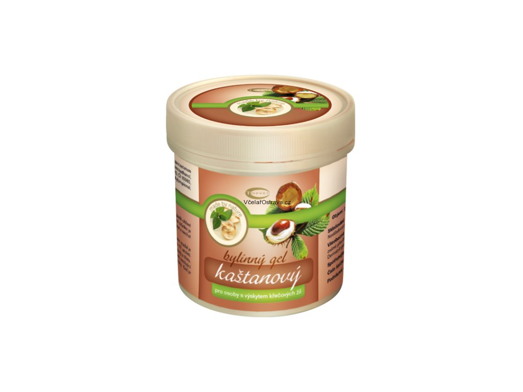 Popis Kaštanový gel Masážní přípravek na kůži pro osoby s výskytem křečových žil. Jírovec maďal je poměrně mladou léčivkou. Na našem území se objevila až koncem 17. století. Účinnými složkami kaštanu jsou aescin, aesculin, flavonoidní glykosidy a třísla. Užívanými částmi jsou květ, plod, semena a mladá kůra. Aescin má zesilující účinek na žilní stěny a zvyšuje jejich pružnost, pomáhá snižovat otoky. Gel je vhodný k aplikaci ke zklidnění pokožky v oblasti hemeroidů. Použití: jemně aplikujte na cílové místo několikrát denně. V žádném případě oblast nemasírujte. Neaplikujte na sliznice a otevřené rány. Pro zvýšení účinku je vhodné nanést na postiženou oblast větší množství přípravku, ovázat a nechat působit dlouhodobě (např. přes noc). Ingredients(INCI): Ingredients (INCI): Aqua, Glycerin, Alcohol Denat., Aesculus Hippocastanum Seed Extract, Arnica Montana Flower Extract, Rutin, Carbomer, Phenoxyethanol, Ethylhexylglycerin, Imidazolidinyl Urea, Sodium Hydroxide, CI 14720, CI 15985, CI 19140, CI 28440, Parfum, Benzyl Benzoate, Butylphenyl Methylpropional, Eugenol, Hexyl Cinnamal, D-Limonene, Linalool Skladování: Uchovávejte v suchu při pokojové teplotě. Neskladovat na přímém slunci. Chránit před mrazem! Případný sediment není závadou přípravku. Všeobecná upozornění: Nepoužívejte při známé přecitlivělosti na některou složku přípravku. Dermatologicky testované. Originální receptura. Výrobce / výrobca: MVDr. Jiří Pantůček, Vodova 40, Brno, 61200, tel.: 541 232 435e-mail: topvet@topvet.cz, www.topvet.cz Země původu / zem pôvodu: Česká republikaDoplňkové parametry