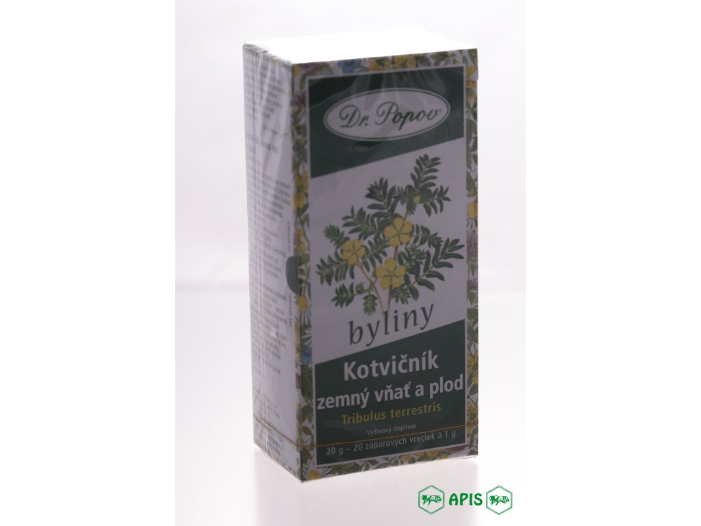 Kotvičník zemní se používá pro udržení normální hormonální aktivity (zejména ve starším věku) a pro normální funkce močové soustavy a reprodukčního systému. Udržuje také přirozenou obranyschopnost a normální činnost nervového a kardiovaskulárního systému. Další použití této byliny doporučujeme vyhledat v herbářích. Složení: Kotvičník zemní nať a plod 100%. Maximální denní dávka obsahuje 2 g sušeného kotvičníku. Doporučená příprava a způsob užití: 1 nálevový sáček zalít 150 ml vroucí vody a nechat 4 hodiny ustát. Pít 2 šálky denně. Soucisející produkty: Kotvičník pozemní s vrbovkou, 50 ml, originální bylinné kapky Kotvičník zemní nať, 50 gDoplňkové parametry