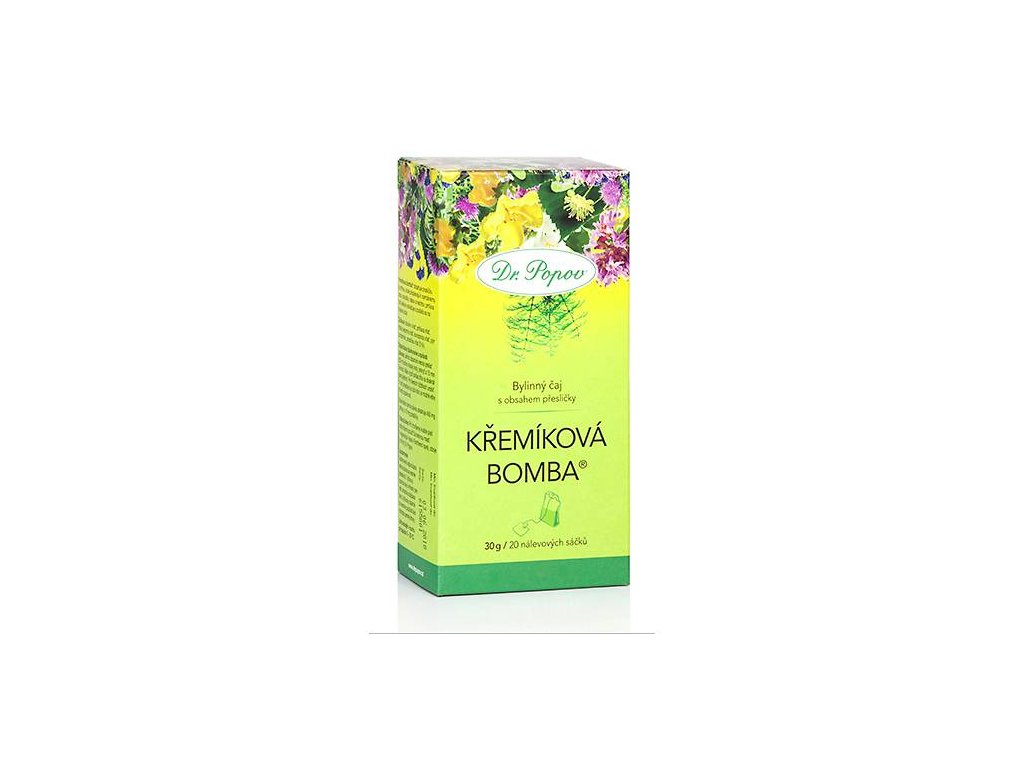 Kdy pít bylinný čaj Křemíková bomba: Bylinný čaj Křemíková bomba® obsahuje vyváženou směs bylin, které přispívají ke zdravému stavu pokožky, vlasů a nehtů. Přeslička pomáhá díky mineralizaci tomu, aby naše pleť, ale i vlasy a nehty zůstaly v dobrém stavu. Kopřiva příznivě působí na zdravý stav kůže a podílí se na jejím hojení. Obsahuje řadu minerálních látek, železo a dodává tělu potřebnou energii i vitalitu. Truskavec působí díky obsahu stilbenu a resveratrolu antioxidačně. Jak bylinný čaj Křemíková bomba připravit a užívat: 1 nálevový sáček přelít 250 ml právě vroucí vody, přikrýt a 15 min louhovat. Čaj vypít během dne nadvakrát (před jídlem). Po šesti týdnech udělat 14 dní přestávku a tuto kúru je možno ještě třikrát zopakovat. Maximální denní dávka obsahuje 450 mg kopřivy a 75 mg přesličky.Složení: truskavec nať, kopřiva nať, máta peprná nať, konopice nať, pýr oddenek, přeslička nať (5 %) Ostatní informace: Nepřekračujte denní doporučenou dávku. Není vhodné pro děti, těhotné a kojící ženy. Výrobek není určen jako náhrada pestré stravy. Uchovávejte v suchu při teplotě 5-25 °C. Obsahuje 20 nálevových sáčků. Doplněk stravy.Doplňkové parametry