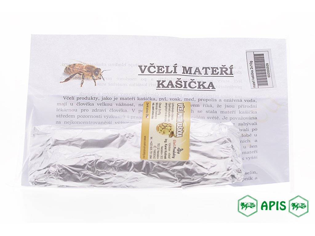 Mateří kašička je čistý včelí produkt s charakteristickou vůní a nakysle kořeněnou chutí, která obsahuje vyvážený komplex látek působících na lidský organismus. Mateří kašička obsahuje minerální látky (vápník, hořčík, železo, draslík, měď, hliník), tuky, cukry (včetně glukózy a fruktózy), puriny, pyrimidiny, aminokyseliny, bílkoviny, hormony a vitamíny. Jedná se o nativní mateří kašičku, což znamená, že je v takovém stavu a konzistenci, v jakém je získaná od včel. Dávkování mateří kašičky: Zpravidla se užívá 0,5 g - 1 g nalačno denně přímo pod jazyk. Necháme pod jazykem rozplynout, asi po 3 min. spolkneme. Po užití je vhodné 30min. nejíst. Takto denně 20 dní užíváme, pak následuje 30 dní pauza a opět se může užívat mateří kaše. U dětí se množství snižuje na polovinu. Mateří kašičku skladujte v chladničce! Neužívat v době těhotenství a při kojení. Je dbát zvýšené opatrnosti u alergiků na včelí produkty. Doplněk stravy. Balení: z důvodu snadné aplikace v injekční stříkačce (nejlépe vidíte, kolik gramů si dávkujete). Obsah balení: 20 g.Doplňkové parametry