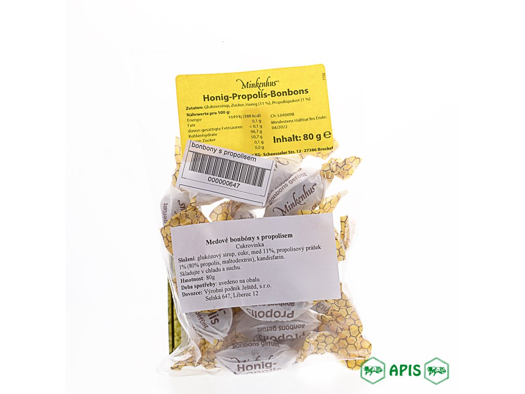 Medové bonbóny s propolisem Bonbóny s medovou náplní a propolisem. Přísady: glukózový sirup, cukr, med 11 %, propolisový prášek 1% (80 % propolis, maltodextrin), kandisfarin. 80 gDoplňkové parametry