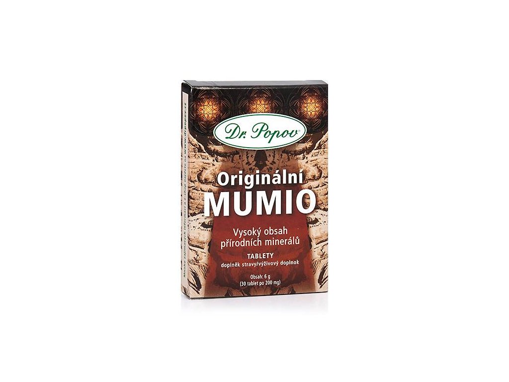 Proč MUMIO tablety užívat: MUMIO tablety mají řadu příznivých účinků na lidský organismus. Ne nadarmo říkají sportovci mumiu „elixír rekordů“. Velmi dobře se hodí pro období, kdy hrozí snížená imunita (např. na podzim) – MUMIO tablety napomáhají totiž přirozené imunitě.MUMIO tablety vám pomohou udržet správný metabolismus sacharidů a lipidů a také udržují klouby a kosti ve zdravém stavu. S MUMIO tabletami doporučujeme užívat také Psyllium. Co je mumio: Mumio je hnědočerná charakteristicky vonící vysokohorská pryskyřice, která se v orientální medicíně užívá více než 3000 let. Pro své mimořádné účinky bylo odnepaměti vysoce ceněno – patřilo dokonce k císařským darům a bylo dražší než zlato…Mumio obsahuje řadu přírodních minerálů, aminokyselin i stopových prvků. Nalezištěm jsou hory v Asii, kde vytváří na stěnách a stropech jeskyň krápníky ve tvaru slz – i proto se mumiu říká „slzy skal“ nebo „zázrak z Asie“. Kde přesně se mumio nachází, zůstává zahaleno tajemstvím – místní sběrači tyto informace tají a předávají si je z generace na generaci. Složení: Přečištěné mumio 100%. Doporučené dávkování a způsob užití: 1 tabletu denně užívat při jídle po dobu 1 měsíce. Po měsíční přestávce je možno kůru zopakovat. Další informace: MUMIO tablety nejsou vhodné pro děti, těhotné a kojící ženy. Neužívejte je při individuální nesnášenlivosti mumia. Mumio není vhodné pro osoby trpící močovými kameny.MUMIO tablety neslouží jako náhrada pestré stravy.Uchovejte na suchém a tmavém místě při pokojové teplotě. Ukládejte mimo dosahu dětí. MUMIO tablety jsou doplňkem stravy. Země původu: Rusko.Doplňkové parametry