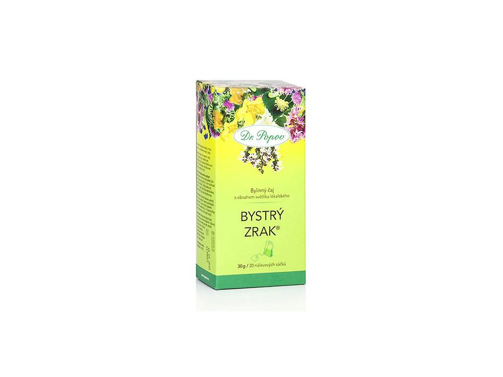 Kdy pít Oční čaj Bystrý zrak: Oční čaj Bystrý zrak obsahuje vyváženou kombinaci tradičně užívaných bylin, mimo jiné světlík lékařský, který přispívá ke zdravému stavu zraku. Jak Oční čaj Bystrý zrak připravit a užívat: 1 sáček čaje přelít 0,25 l právě vroucí vody, přikrýt, 12 min vylouhovat a vypít po doušcích. Podle potřeby pít denně 1 – 3 šálky. Maximální denní dávka obsahuje 225 mg světlíku lékařského. Další tipy a doporučení: Dále doporučujeme omezit kouření, alkohol, kávu, tuky a koření, denně (i dlouhodobě) konzumovat 1 čajovou lžičku loupaného dýňového semínka a 2 – 3 čajové lžičky semene slunečnice (nutno dobře rozžvýkat). Složení: rooibos list, truskavec nať, růžový ibišek květ, měsíček květ, klanopraška plod, světlík nať (5 %), fenykl plod, chrpa květ, mařinka vonná nať Ostatní informace: Nepřekračujte denní doporučenou dávku. Není vhodné pro děti, těhotné a kojící ženy. Výrobek není určen jako náhrada pestré stravy. Uchovávejte v suchu při teplotě 5-25 °C. Obsahuje 20 nálevových sáčků. Doplněk stravy.Doplňkové parametry