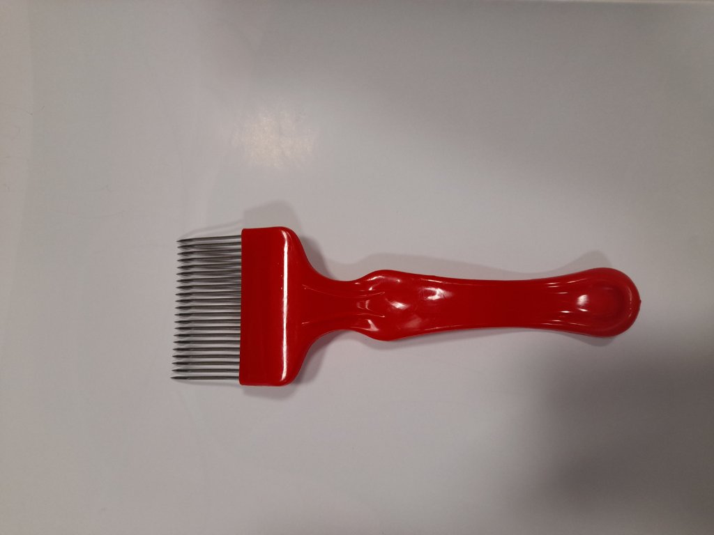 ODVÍČKOVACÍ VIDLIČKA 1X LOMENÁ, PLASTOVÁ RUKOJEŤ Vidlička odvíčkovací - plastová rukojeť, 1x lomená - nerez jehly. Odvíčkovací vidlička má 18 zesílených nerezových jehel. Šířka záběru je 7 cm. Vidlička má plastovou rukojeť, která padne skvěle do ruky. Vidlička je nepostradatelnou pomůckou každého včelaře. Odvíčkovací vidlička napomáhá rychlé a spolehlivé práci. Bez této pomůcky se neobejde žádný včelař. Medobraní je období, kdy včelaři sklízí plody své celoroční práce. Je tedy důležité, aby byly pomůcky vyrobeny z kvalitních materiálů. Snažíme se nabídnout co nejvíce pomůcek k medobraní. Odvíčkování je proces, během něhož je odstraněna tenká vrstva vosku uzavírající plné buňky medu.Praktická vidlička má 18 silnějších jehel (pro delší životnost) a prakticky tvarovanou rukojeť.Doplňkové parametry