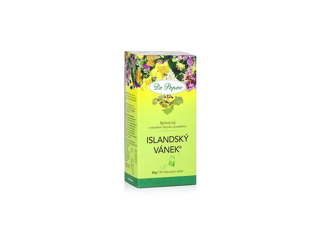 Kdy pít Průduškový čaj Islandský vánek: Průduškový čaj Islandský vánek podporuje díky obsaženým bylinám (lišejník islandský, jitrocel, podběl) zdravé dýchací cesty. Do čaje jsme přidali také lipový květ, který pomáhá snadnějšímu vykašlávání a společně s lišejníkem posilují přirozenou obranyschopnost. Jak Průduškový čaj Islandský vánek připravit a užívat: 1 nálevový sáček přelít 250 ml právě vroucí vody. Přikrýt a po 12 min louhování pít co nejteplejší. Denně vypít 1 – 3 šálky, nejdůležitější je ranní šálek úplně nalačno. Maximální denní dávka obsahuje 1400 mg lípy, 400 mg podbělu a 200 mg lišejníku. Složení: lípa květ, bez černý květ, měsíček květ, podběl list (10 %), vřes nať, jitrocel list, lišejník islandský stélka (5 %) Ostatní informace: Nepřekračujte denní doporučenou dávku. Není vhodné pro děti, těhotné a kojící ženy. Výrobek není určen jako náhrada pestré stravy. Uchovávejte v suchu při teplotě 5-25 °C. Obsahuje 20 nálevových sáčků. Doplněk stravy.Doplňkové parametry