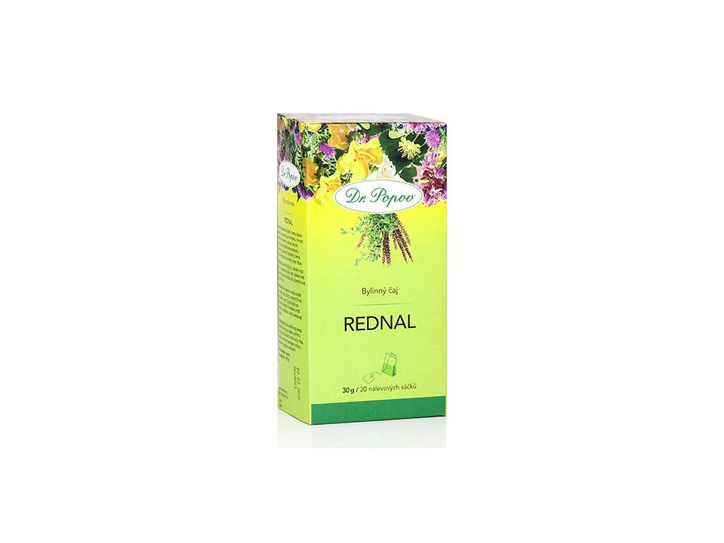 Kdy pít bylinný čaj Rednal: Bylinný čaj Rednal obsahuje ibišek, černý rybíz a břízu, které udržují normální činnost močových cest a odvod tekutin z organizmu (odstranění přebytku kyseliny močové). Tužebník a černý rybíz podporují zdravý stav kloubů. Jak bylinný čaj Rednal připravit a užívat: 4 nálevové sáčky přelít 1 l vroucí vody, přikrýt a nechat 15 min vylouhovat a vypít. Čaj pít vlažný po doušcích celý den. Po měsíci udělat týdenní přestávku a opět pokračovat v kúře. Složení: vřes nať (30 %), truskavec nať (20 %), mateřídouška nať, růžový ibišek květ, černý rybíz list, bříza list, tužebník květ, jablečník nať Ostatní informace: Nepřekračujte denní doporučenou dávku. Není vhodné pro děti, těhotné a kojící ženy. Výrobek není určen jako náhrada pestré stravy. Uchovávejte v suchu při teplotě 5-25 °C. Obsahuje 20 nálevových sáčků.Doplňkové parametry