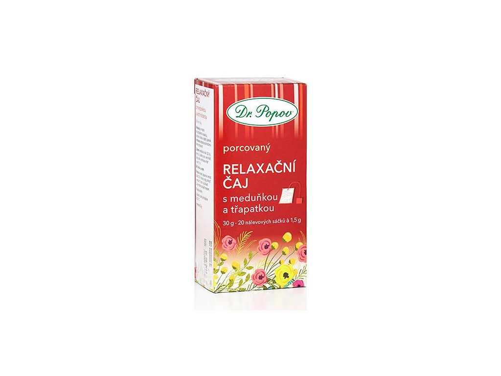 Kdy pít Relaxační čaj s meduňkou a třapatkou: Relaxační čaj s meduňkou a třapatkou je směs ze 6 tradičně užívaných bylin. Meduňka je výtečná pro každodenní relaxaci, pozitivní náladu a dobrý spánek (napomáhá usínání). Podporuje duševní pohodu a hormonální rovnováhu. Třapatka (echinacea) podporuje přirozenou obranyschopnost a zelený čaj působí antioxidačně. Jak Relaxační čaj s meduňkou a třapatkou připravit: 1 nálevový sáček přelít 0,25 l vroucí vody, přikrýt a nechat 15 minut vylouhovat. Čaj je možno přisladit medem. Složení: meduňka nať (32 %), zelený čaj, jablko plod, vřes nať, skořice kůra, třapatka nať a květ (5 %) Ostatní informace: Skladovat v suchu při teplotě do 25 °C. Obsahuje kofein. Bez barviv a aromat. Obsahuje 20 nálevových sáčků.Doplňkové parametry