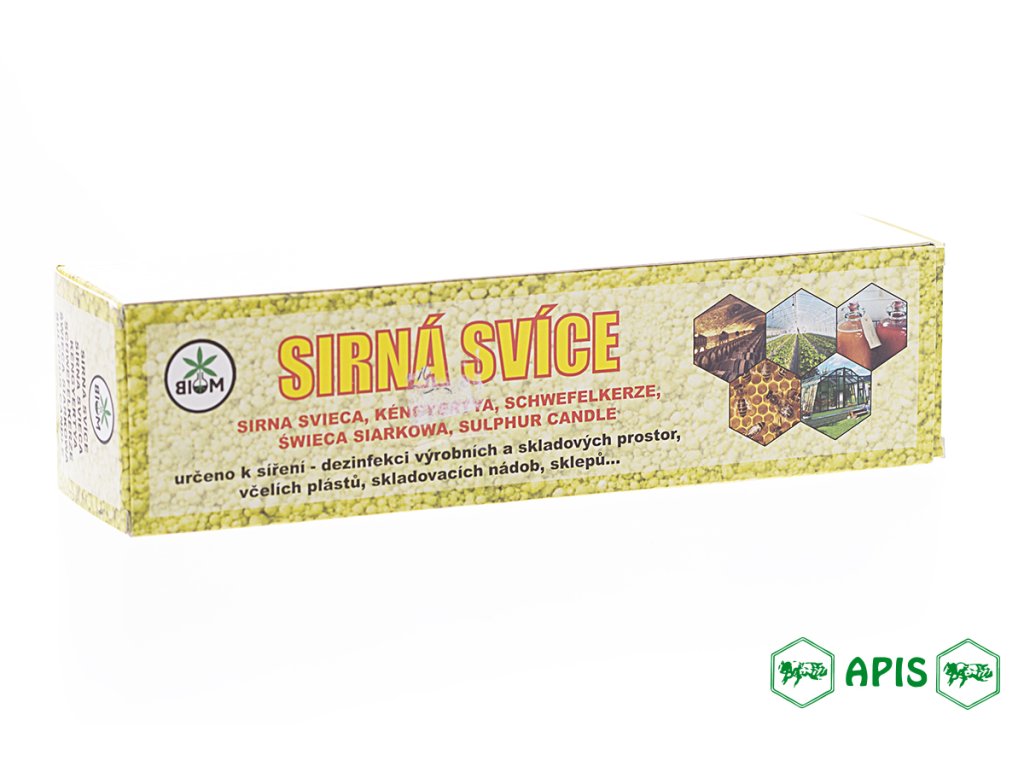 Popis produktu: Prostředek k desinfekci výrobních a skladovacích prostor. Ničí mikroorganismy a plísně. Jedna sirná svíce postačí k ošetření cca 12 - 15 m3 uzavřeného prostoru. Vlastnosti: světle žlutý pevný váleček tvaru svíce, mírně zapáchající po síře. Použití: Svíce se vloží do nehořlavé nádoby a zapálí se od horní části (svíce nemá klasický knot, zapalujeme zápalkami, zapalovačem). Svíce při hoření teče, proto je nutné uložení do nehořlavé nádoby k zachycení síry. Místnost nebo prostor po zapálení svíce ihned opustíme a uzavřeme! Po 2 - 4 hodinách místnost vyvětrejte. Včelaři – vysířování veškerého včelařského vybavení, nástrojů a pomůcek, výrobní prostory. Vinaři a potravináři – vysířování skladů, hal, výrobních prostor, vinných sklepů. Zahrádkáři – vysířování sklepů, skleníků, skladů a hal před opětovným naskladněním ovoce a zeleniny. Skladování: Skladujte v uzavřeném originálním obalu, v suchu, odděleně od potravin. Uchovávejte mimo dosah dětí. Balení: cca 700 gDoplňkové parametry