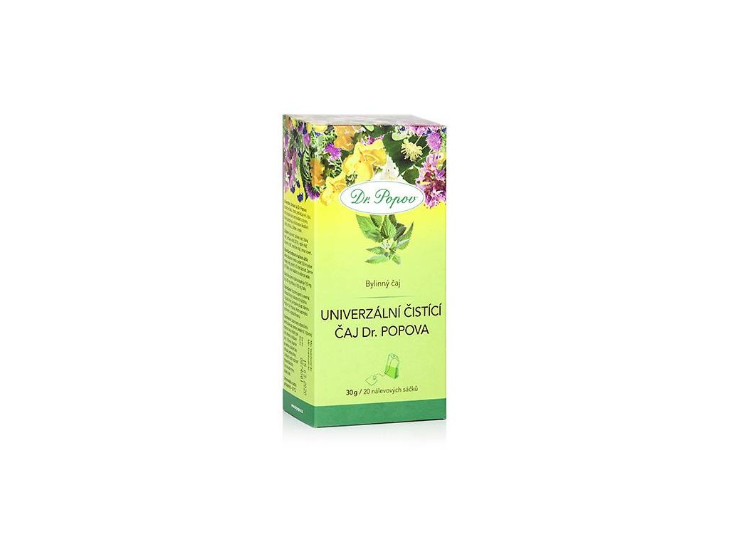 Kdy pít Univerzální čistící čaj: Univerzální čistící čaj obsahuje byliny vhodné pro čištění organizmu. Kopřiva čistí krev a podporuje správnou činnost ledvin, lípa je známá pro své antioxidační vlastnosti a společně s maceškou se také podílejí na čištění krve. Pro vyšší účinek jsme do čaje použili ještě ibišek, řepík, třezalku, řebříček a oman.Univerzální čistící čaj je roky prověřený a patří mezi nejoblíbenější bylinné směsi. Jak Univerzální čistící čaj připravit a užívat: Příprava čaje je snadná. 1 vrchovatou lžičku směsi (cca 2 g) přelijte 0,25 l právě vroucí vody, přikryjte a nechte 15 minut vylouhovat. Denně užívejte dva šálky, jeden ráno nalačno a druhý večer po jídle. Složení: lípa květ, růžový ibišek květ, maceška nať, kopřiva nať, řepík nať, třezalka nať, řebříček nať, oman kořen Ostatní informace: Nepřekračujte doporučené denní dávkování. Výrobek není určen pro děti, těhotné a kojící ženy. Neslouží jako náhrada pestré stravy. U citlivých osob možnost fotosenzibilizace. Čaj je doplňkem stravy. Uchovávejte v suchu při teplotě 5 – 25 °C. Obsahuje 20 nálevových sáčků.Doplňkové parametry