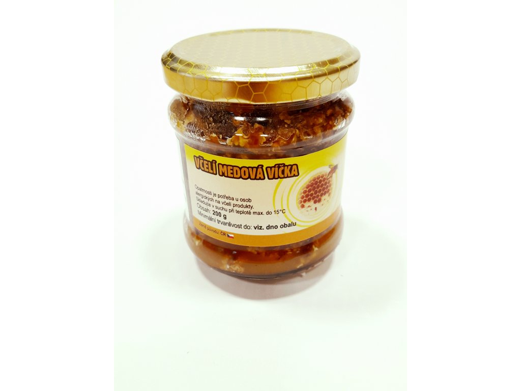 Jde o včelí produkt, který se prodává spíše sezónně v době medobraní, protože se získává při odvíčkovávání medových plástů. V podstatě se jedná o víčka medových buněk z medových pláství. Tato víčka obsahují velké množství dezinfekčních látek, které chrání med přírodním způsobem před vlhkostí, bakteriemi a negativními vlivy. Při žvýkání medových víček se tyto dezinfekční látky uvolňují. jsou tak velmi účinné proti nachlazení a zánětům v krku slouží jako prostředek čistící nosohltan a to hlavně při zápalech čelní dutiny a senné rýmě vynikající účinky při žvýkání víček jsou prokázány i při paradentóze zubů a zánětů dásní žvýkání včelích víček má více příznivých účinků, např. aktivizuje tvorbu slin a žaludečních šťáv, mechanicky čistí zuby od zubního kamene a nikotinového povlaku u kuřáků Včelí medová víčka jsou tvořena voskem s příměsí medu a propolisu. Užívání: žvýkat dle libosti a po vyžvýkání je možno vosk v rozumném množství i polknout, protože je nestravitelný a prochází zažívacím traktem beze změn, kde je schopen na sebe vázat škodliviny. Samozřejmě je možné vyžvýkaný vosk vyplivnout.Diskuze