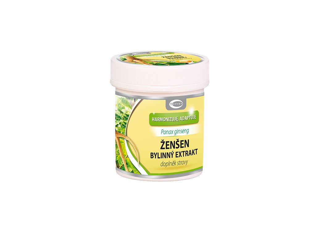 Popis Ženšen bylinný extrakt - Panax ginseng Harmonizuje tělo a dušiHarmonizuje telo a dušu Doplněk stravy / Doplnok stravy Ženšen přispívá k udržení normální funkce imunitního systému. Podporuje snížení míry únavy a vyčerpání. Přispívá k normální psychické činnosti, podporuje koncentraci a výkon. Pozitivně ovlivňuje duševní aktivitu ve stresu, vitalitu a fyzickou výkonnost. Jedná se o silný antioxidant. Obsah: 1 tobolka Denní dávka 1-2 tobolky % DDD Denní doporučená dávka Ženšen standardizovaný extrakt 70 mg 70-140 mg Není stanoveno Vitamín C 50 mg 50-100 mg 62,5-125 % DDD Složení / zloženie: želatina (tobolka/kapsula), žen-šen štandardizovaný extrakt (Panax ginseng), vitamín C (kyselina L-askorbová), Mikrokrystalická/mikrokryštalická celulóza (plnidlo) Doporučené dávkování / odporúčané dávkovanie: 1 - 2 tobolky denně/1 – 2 kapsuly denne. Nepřekračujte doporučené denní dávkování/neprekračujte odporúčané denné dávkovanie. Skladování: Uchovávejte v suchu při pokojové teplotě. Neskladovat na přímém slunci a v mrazu.Skladovanie: Uchovávajte v suchu priizbovej teplote. Neskladovať na priamom slnku a v mraze. Všeobecná upozornění: Doplněk stravy. Není vhodné pro děti do 3 let, těhotné a kojící ženy. Nenahrazuje pestrou a vyváženou stravu. Ukládat mimo dosah dětí!Všeobecné údaje: Doplnok stravy. Nie je určený deťom do 3 rokov, tehotným a dojčiacim ženám. Nenahrádza pestrú stravu. Ukladať mimo dosahu detí! Obsah: 60 tobolek/kapsúl Výrobce / výrobca: Green idea s.r.o., Vodova 40, Brno, 61200, tel.: 541 232 435e-mail: topvet@topvet.cz, www.topvet.cz Země původu / zem pôvodu: Česká republika Doplněk stravy - definice dle zákona Doplněk stravy je potravina, jejímž účelem je doplňovat běžnou stravu a která je koncentrovaným zdrojem vitaminů a minerálních látek nebo dalších látek s nutričním nebo fyziologickým účinkem, obsažených v potravině samostatně nebo v kombinaci, určená k přímé spotřebě v malých odměřených množstvích. Účinnost přípravku a zajištění kvality nejsou při schvalování doplňků stravy posuzovány. Nicméně výrobce nesmí deklarovat nepravdivá tvrzení o účinku přípravku (zákaz klamání spotřebitele). Deklarované účinky musí být schopen kdykoliv doložit. Doplňky stravy musí splňovat veškeré platné normy kladené na potraviny. Jejich dodržování kontroluje Státní zemědělská a potravinářská inspekce (SZPI). Doplňky stravy nesmějí být na obalu označeny léčebnou indikací (ani nesmějí vyléčení či prevenci chorob naznačovat), což je vyhrazeno pouze pro léčiva. Smějí být ale uváděny příznivé účinky na zdravotní stav uživatele - tzv. zdravotní tvrzení. Totéž platí i pro reklamu. Rovněž se nesmí uvádět ani naznačovat, že vyvážená a různorodá strava nemůže poskytnout dostatečné množství živin.Doplňkové parametry